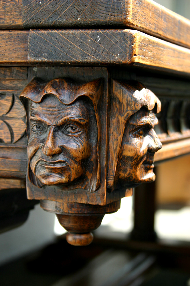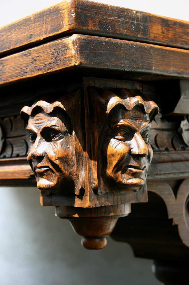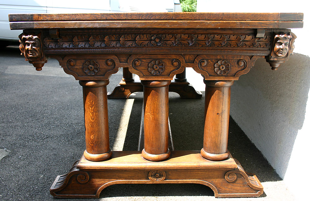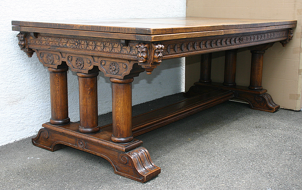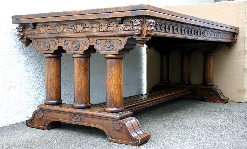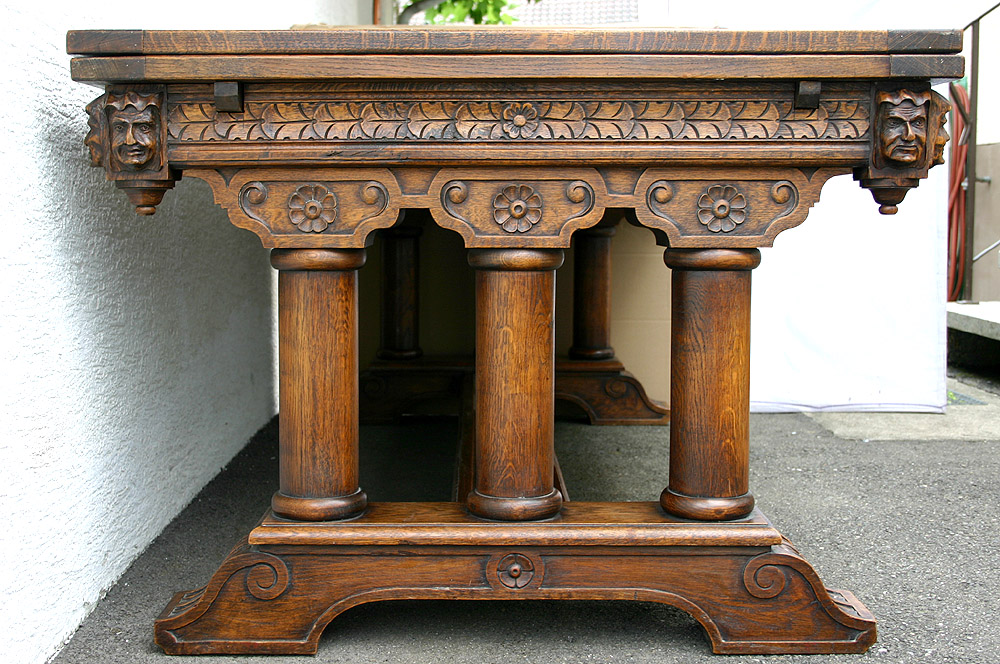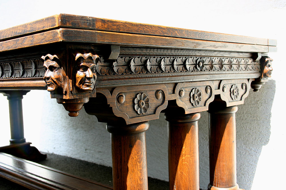 Sechs massive Säulen tragen die Tischplatte. Feine Schnitzereien an allen vier Seiten des Kulissentisches zeugen von höchster Handwerkskunst und Handarbeit.