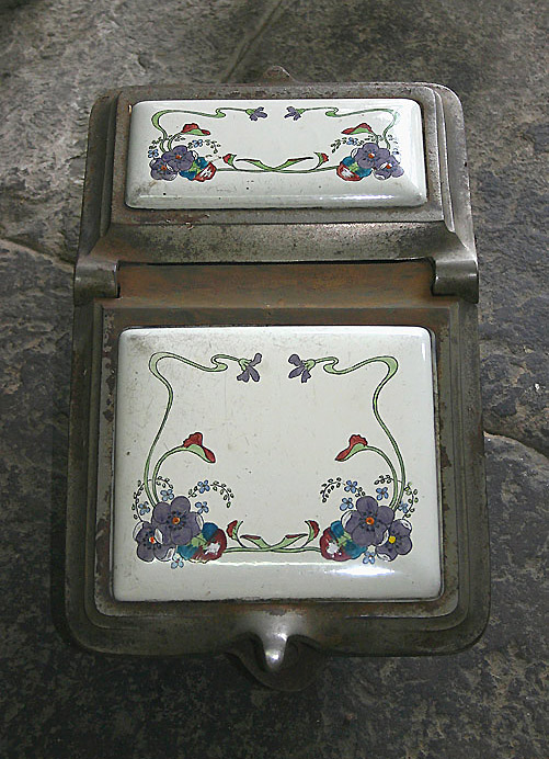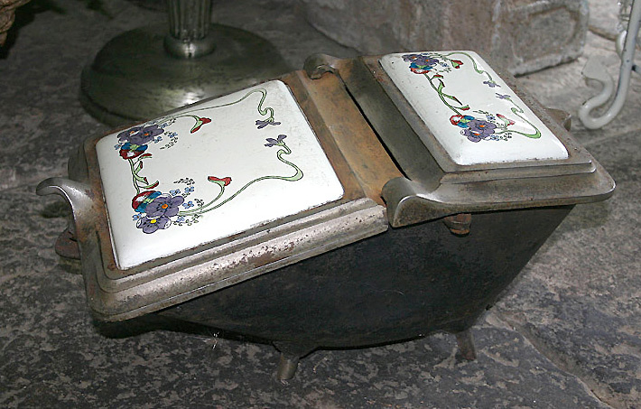 Gusseiserne Kohlenkiste mit Emaille und Veilchenmotiv